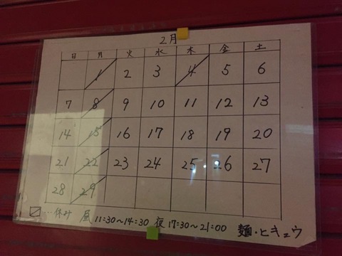 ちょっと遅れましたが、2016年2月の麺・ヒキュウさんの営業情報です。