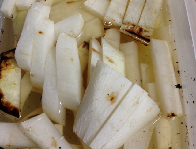さて、さて・・・定休日に頂いた『今田町の大根』は、焼いてからの甘酢漬けにしました!