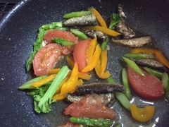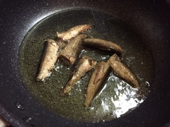 オリーブオイルでイワシを色付く程度ソテーします。こうするとパスタとあえた時身が崩れにくく、風味もオイルに移ります。
